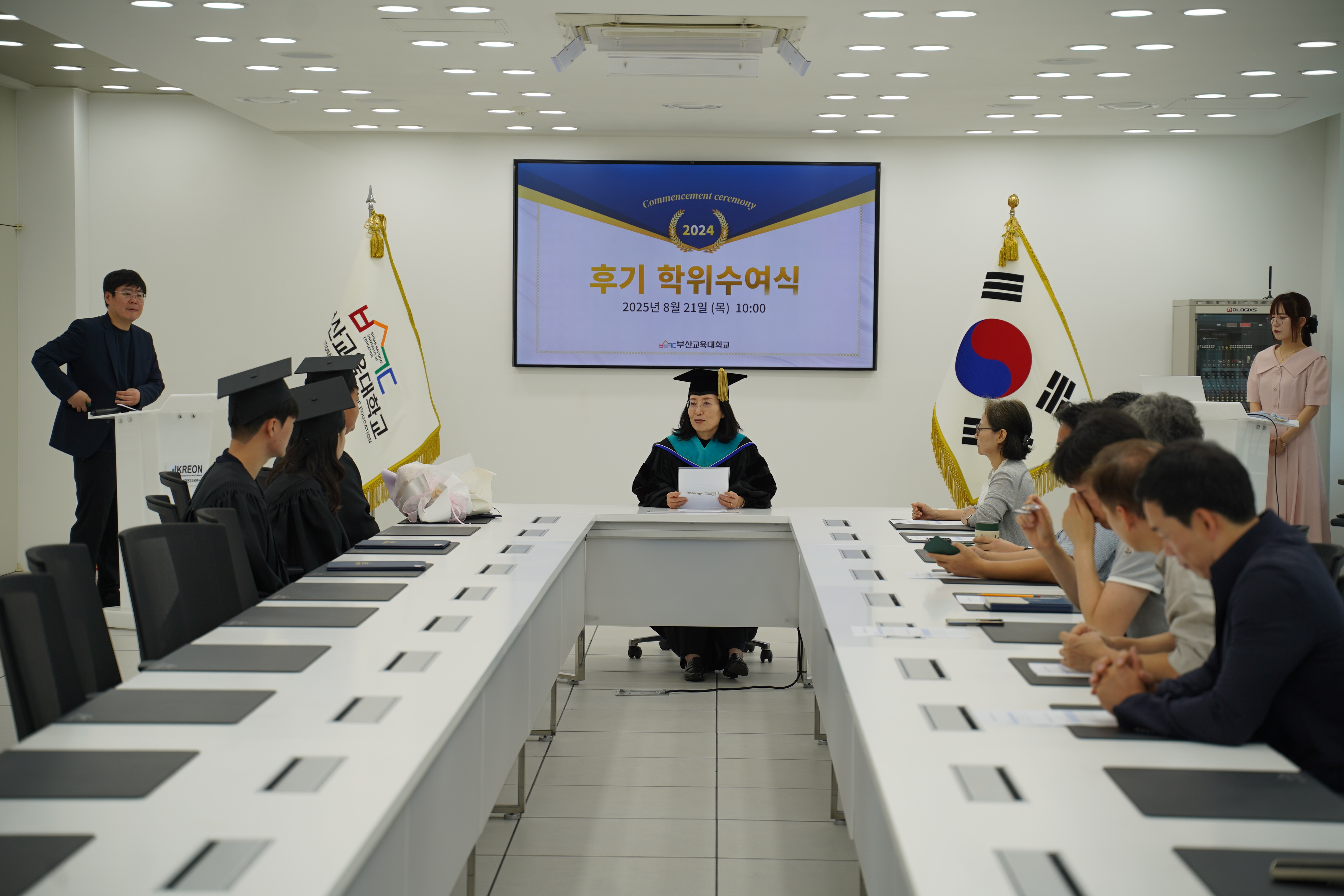 2024학년도 후기 학위수여식(제61회)이 8월 21일(목) 오전 10시 본관 8층 회의실에서 개최됐다. 박수자 총장은 졸업생들에게 한새벌에서 고민하던 열정적 자세와 풍부한 경험, 지혜를 바탕으로 새로운 사회의 희망이 될 것이라는 응원의 말과 함께 축하 인사를 건넸다. 이날 학위수여식에는 총장과 보직교수, 학부모 등이 참석해 졸업생들에게 격려하고 축하하는 시간을 가졌다.