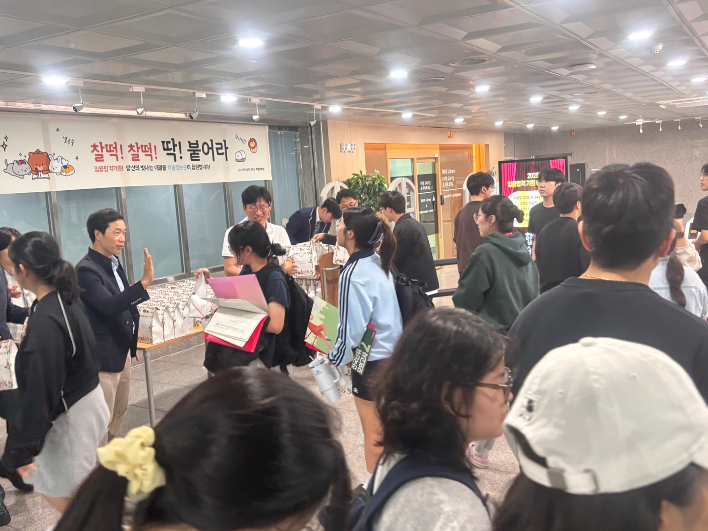 초등임용시험을 준비 중인 4학년 재학생들을 응원하기 위해, 학술정보관은 9월 24일(수) ‘임용합격 기원’ 이벤트를 개최했다. 이 행사는 2007년부터 이어져온 전통으로, 임용시험을 준비하는 학생들에게 격려와 응원의 마음을 전하기 위해 기획됐다. 이날 행사에는 총장, 학술정보관장, 주요 보직자들이 직접 참석하여, 준비된 선물이 담긴 상자를 학생들에게 전달하며 따뜻한 응원의 메시지를 전했다. 행사는 학술정보관 2층 입구에서 진행됐으며, 200명의 4학년 재학생에게 임용시험 합격을 기원하는 간식 및 실용적인 학용품이 담긴 선물상자가 증정됐다. 학술정보관은 앞으로도 재학생들을 위한 다양한 이벤트를 이어가며, 학생들의 꿈과 목표를 응원하는 활동을 적극적으로 지원할 예정이다.