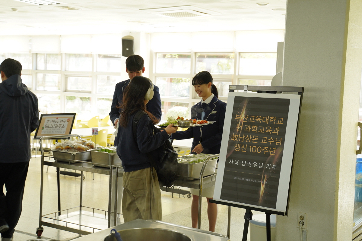 지난 10월 29일(수), 부산교육대학교 학생식당에는 점심시간을 맞아 달콤한 향기가 가득했다. 이날 학생식당에서는 도넛과 사과주스가 무료로 제공됐는데, 이는 故 남상돈 과학교육과 교수의 아들 남민우 님이 부친의 탄생 100주년을 기념하며, 대학에 대한 감사의 마음을 담아 학생과 교직원을 위한 간식비를 발전기금으로 기부한 데서 비롯된 뜻깊은 행사였다.